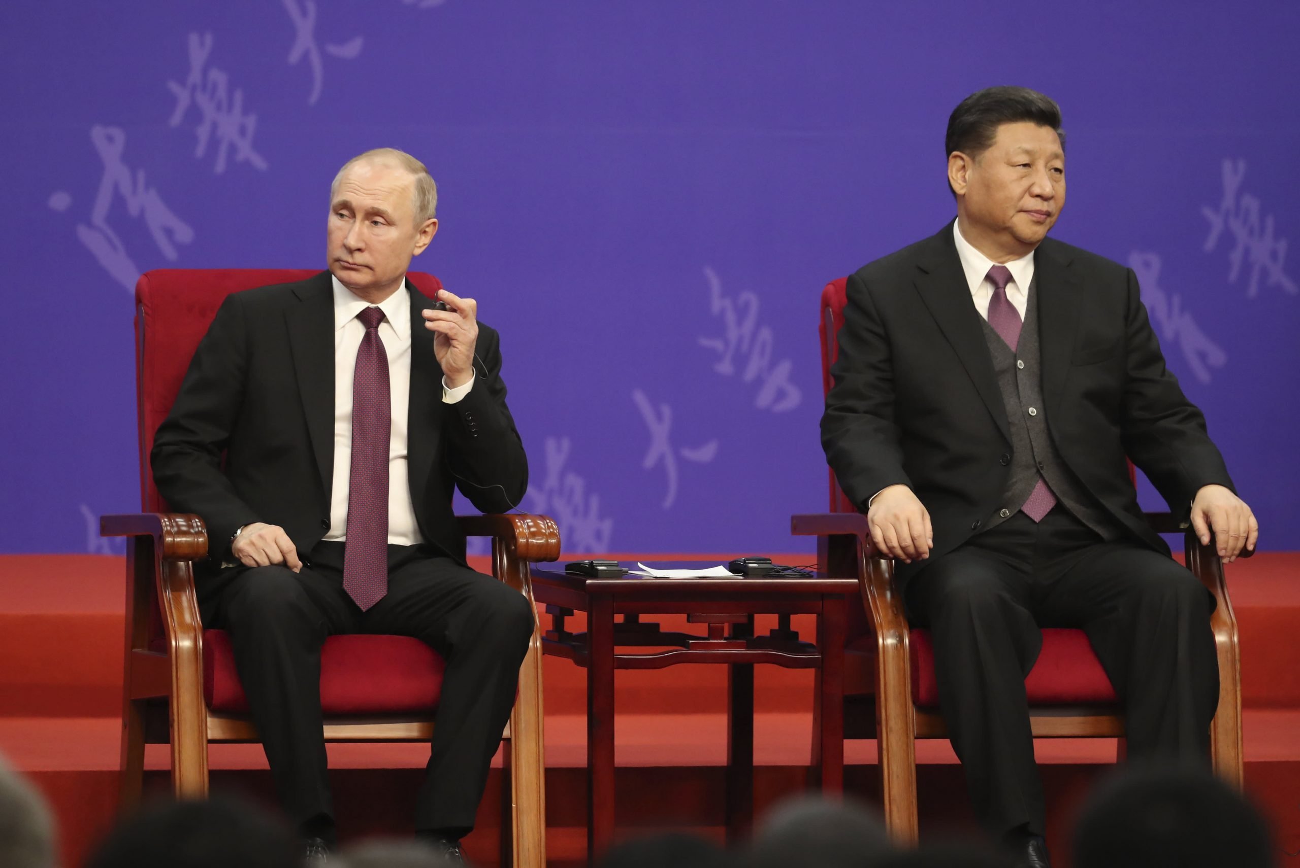 Russian President Vladimir Putin, left, and Chinese President Xi Jinping, right, attend the Tsinghua Universitys ceremony, at Friendship Palace on April 26, 2019 in Beijing, China.