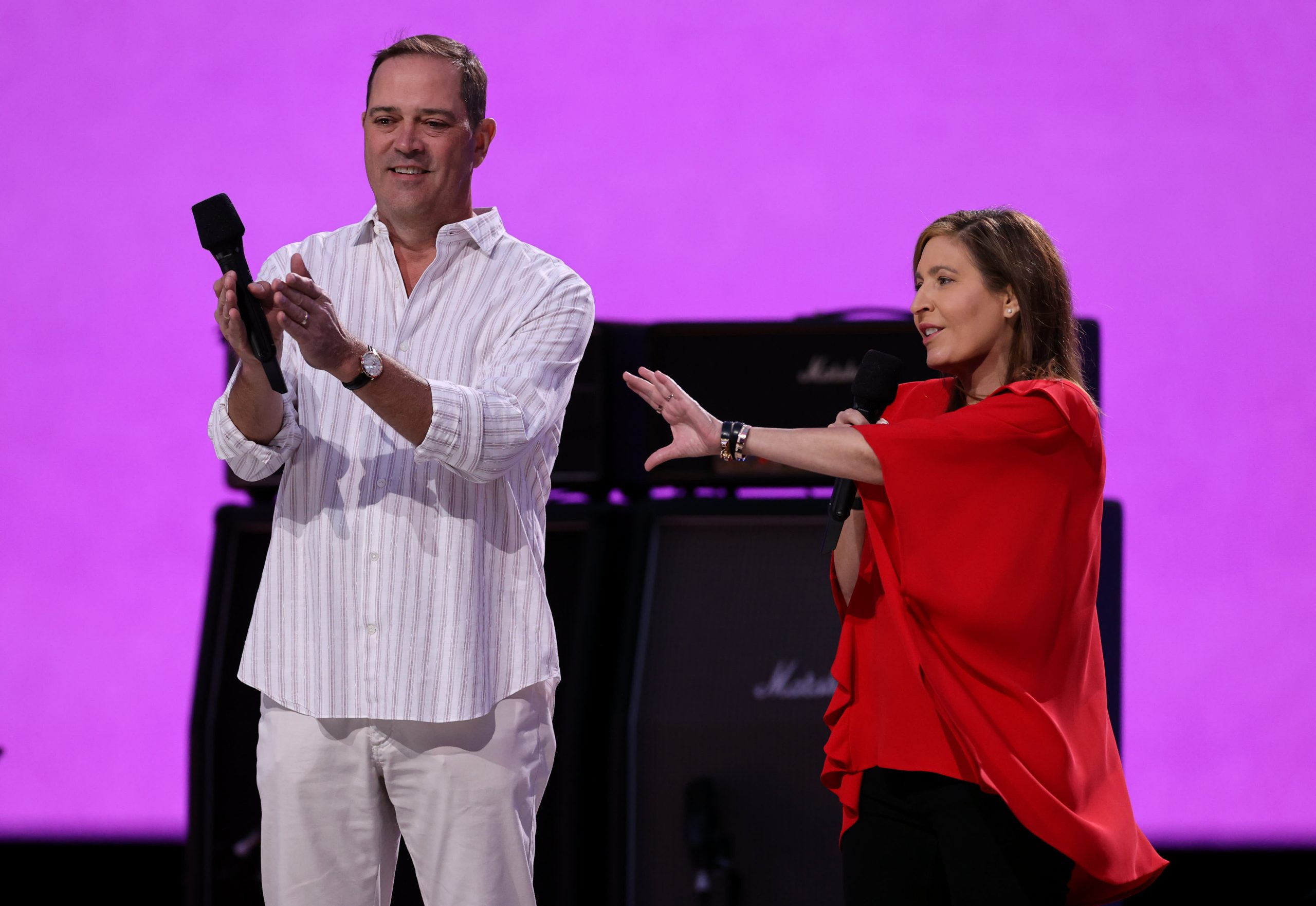 In this image, released on May 2, 2021, from left, Cisco CEO Chuck Robbins and Bea Perez, Chief Public Affairs, Communications and Sustainability Officer of the Coca-Cola Company, speak during Global Citizen VAX LIVE: The World Reunification Concert at SoFi Stadium on stage in Inglewood, California.