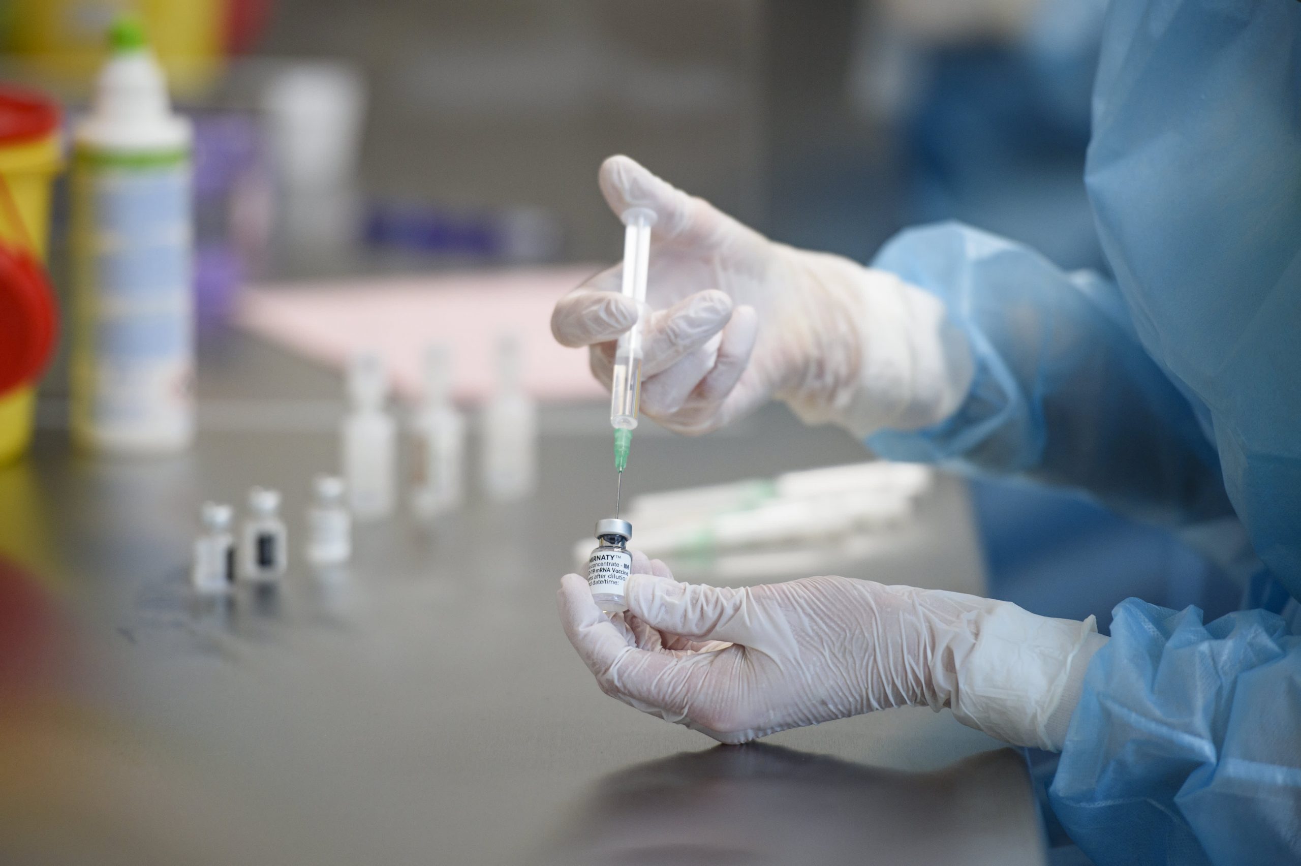 Syringes are filled with Astrazeneca’s vaccine in the pharmacy.