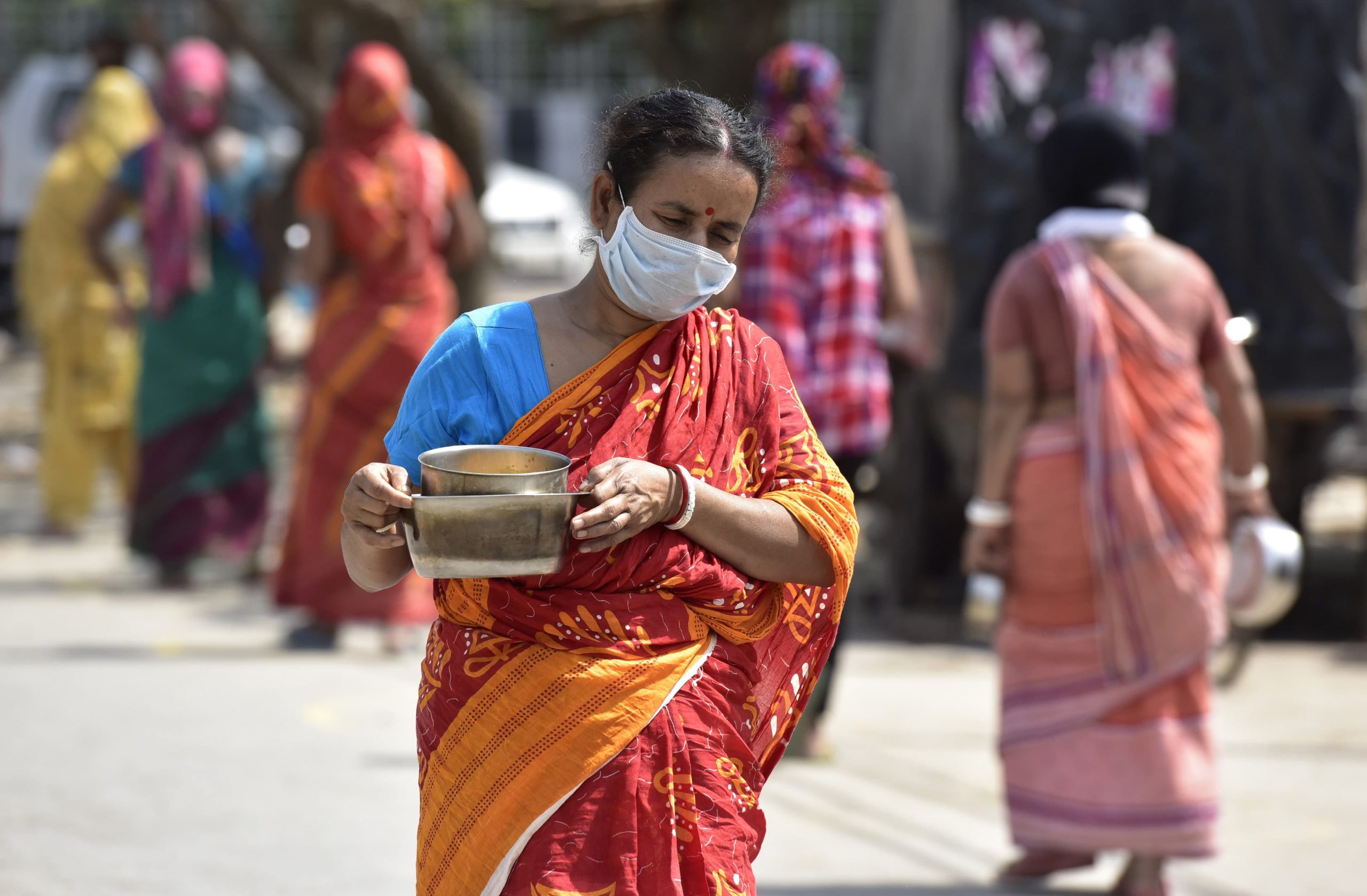 NOIDA, INDIA – APRIL 11: A woman holds a pot at a food distribution by Noida Authority in Morna Village in Sector 35 on the eighteenth day of the 21 day coronavirus limit lockdown on April 11, 2020 in Noida, India. (Photo by Virendra Singh Gosain / Hindustan Times via Getty Images)