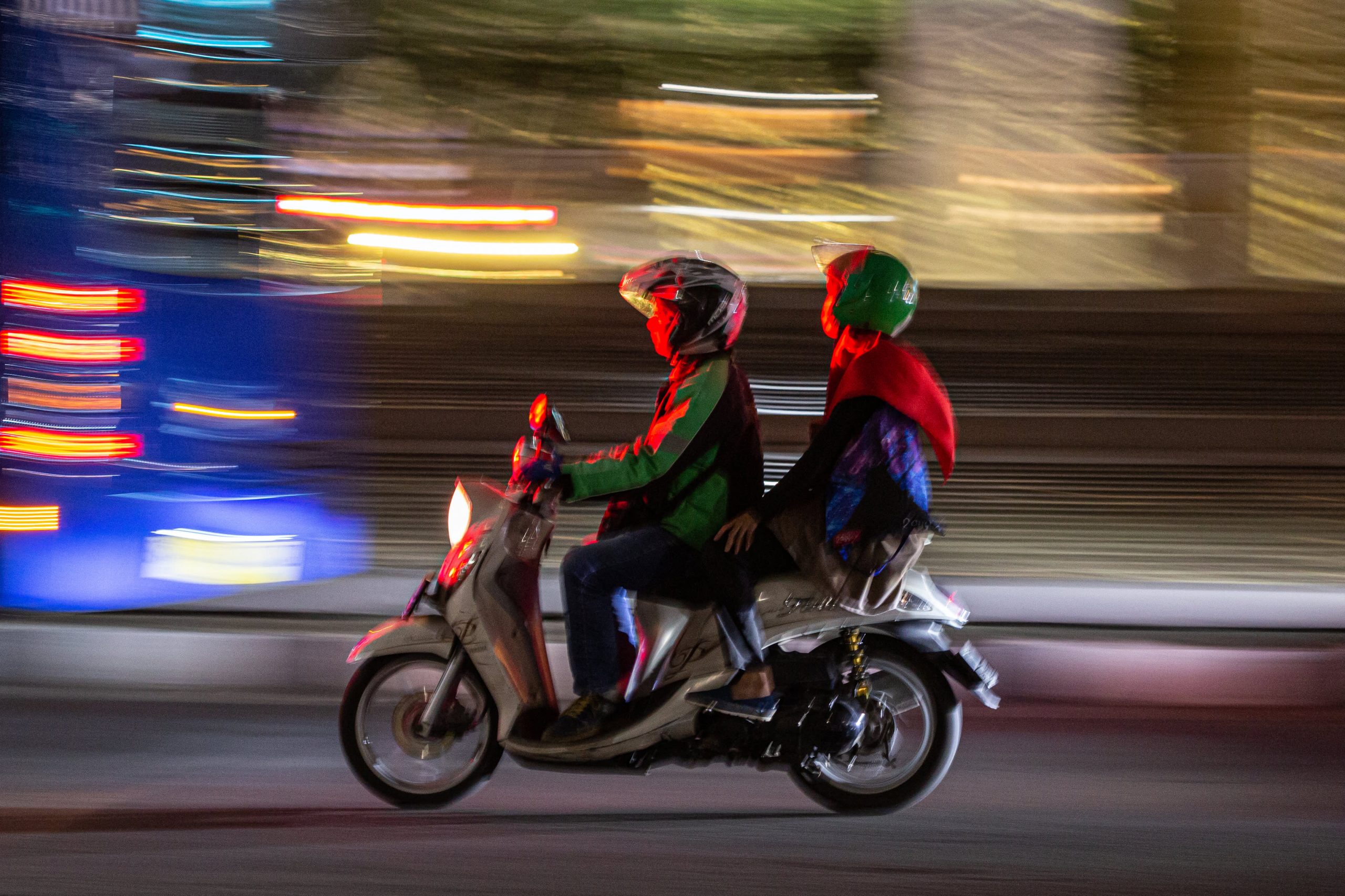 An Indonesian driver from the Gojek hail service and his passenger commute in Jakarta on March 5, 2021.
