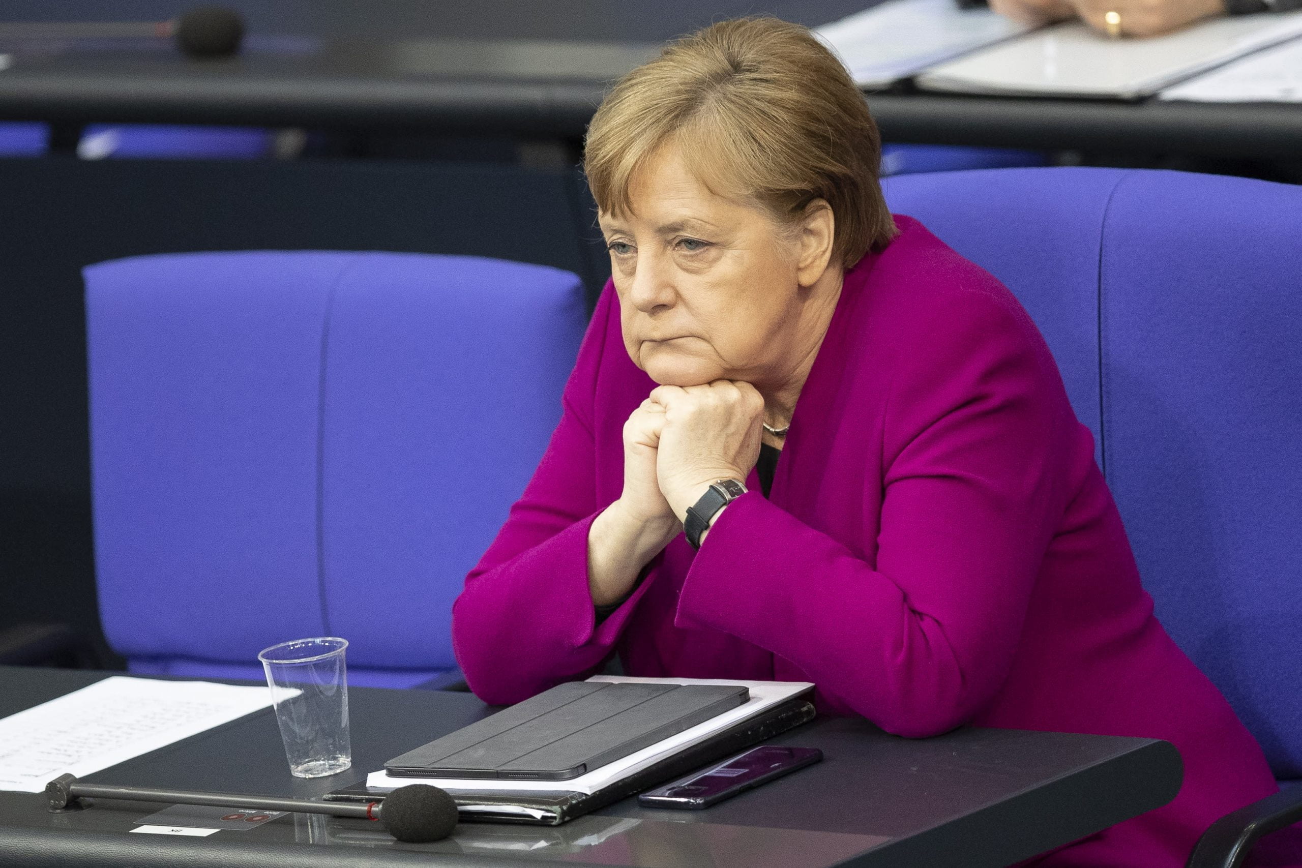 BERLIN, GERMANY – APRIL 23: Chancellor Angela Merkel (CDU) sits at the Bundestag on April 23, 2020 in Berlin. Germany is still at the beginning of the coronavirus pandemic and will have to live with it for a long time, said the Chancellor.