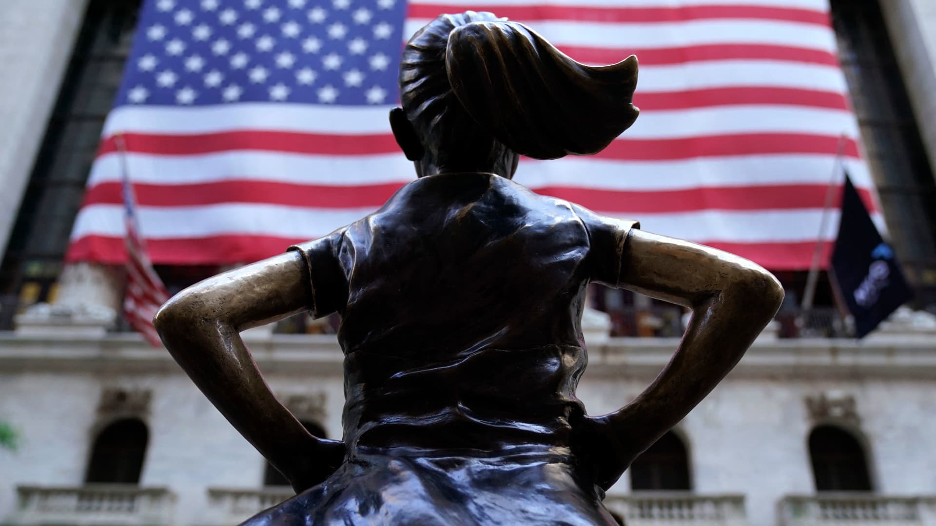 The “Fearless Girl,” a bronze sculpture by Kristen Visbal, stands in front of the New York Stock Exchange building in New York City on May 31, 2023.