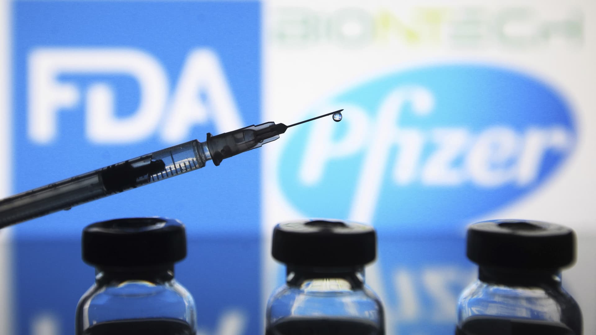 In this photo illustration, vials and a medical syringe seen in front of the Food and Drug Administration (FDA) of the United States and Pfizer Pharmaceutical company logos. FDA approves Pfizer/BioNTech the COVID-19 coronavirus vaccine for emergency use in the US, reportedly by media.