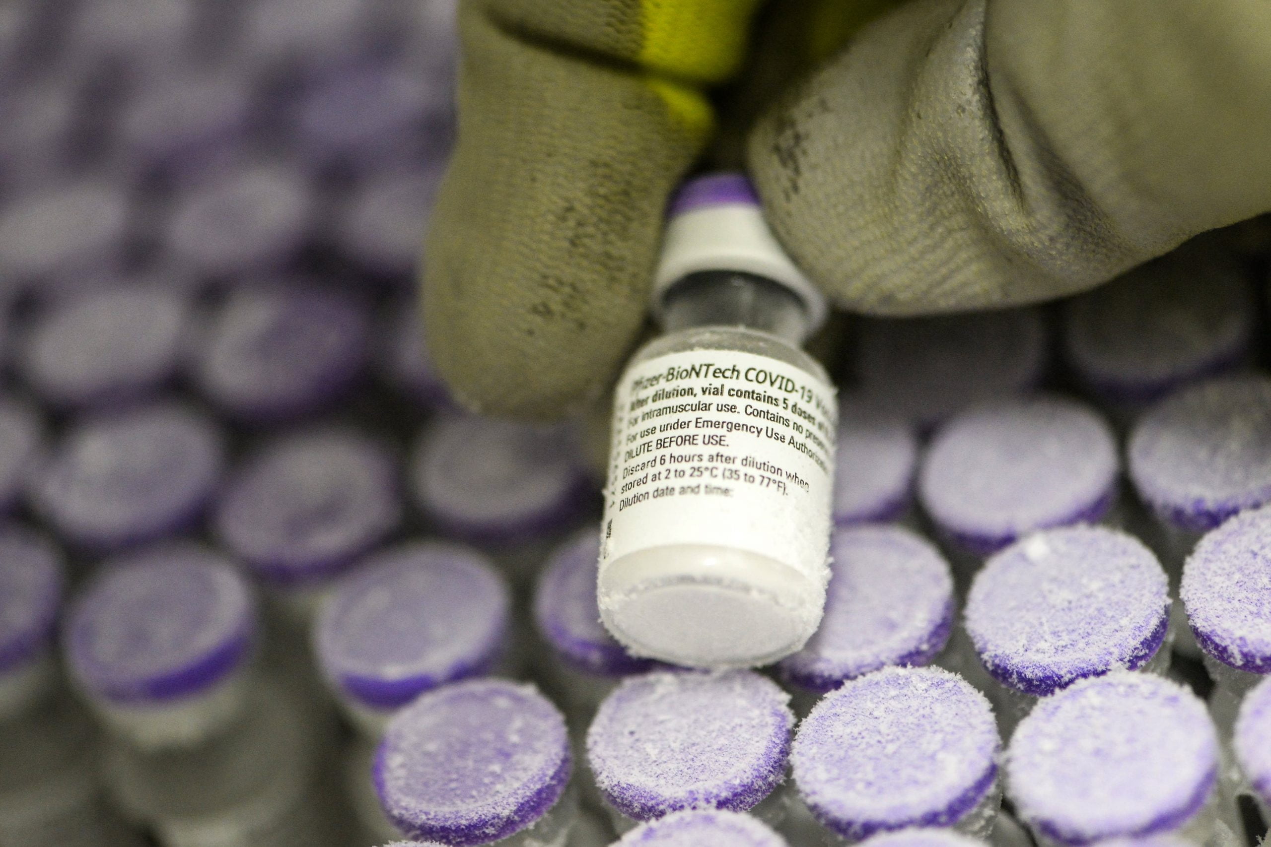 A picture taken on January 15, 2021 shows a pharmacist holding a vial of undiluted Pfizer BioNTech vaccine for Covid-19 with gloved hands, which is stored at -70 ° in a super freezer at Le Mans hospital in northwestern France became country runs a vaccination campaign to fight the spread of the novel coronavirus.