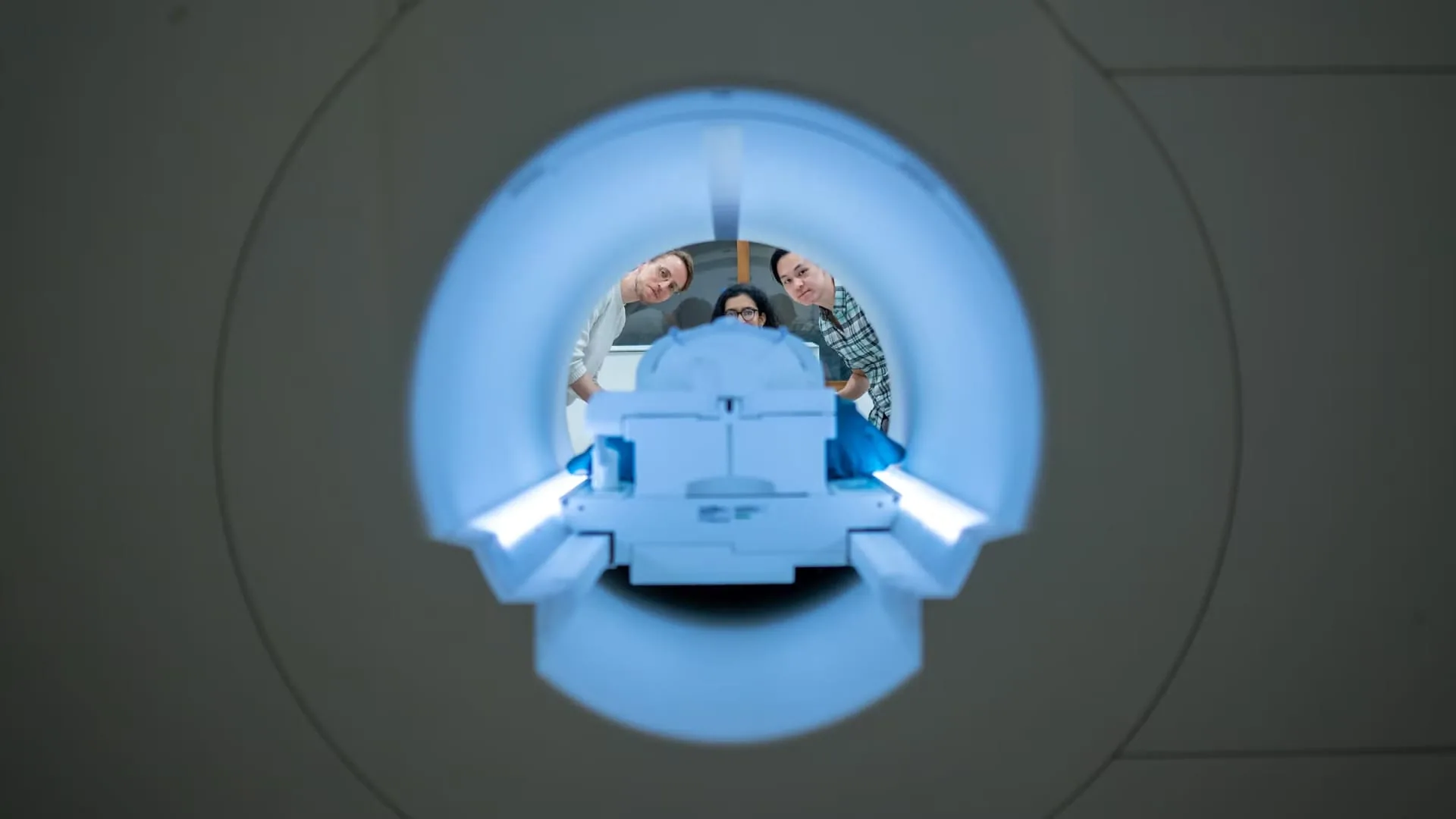 Alex Huth (left), Shailee Jain (center) and Jerry Tang (right) prepare to collect brain activity data at the University of Texas Biomedical Imaging Center at Austin. The researchers trained their semantic decoder using dozens of hours of participants’ brain activity data collected in an fMRI scanner.