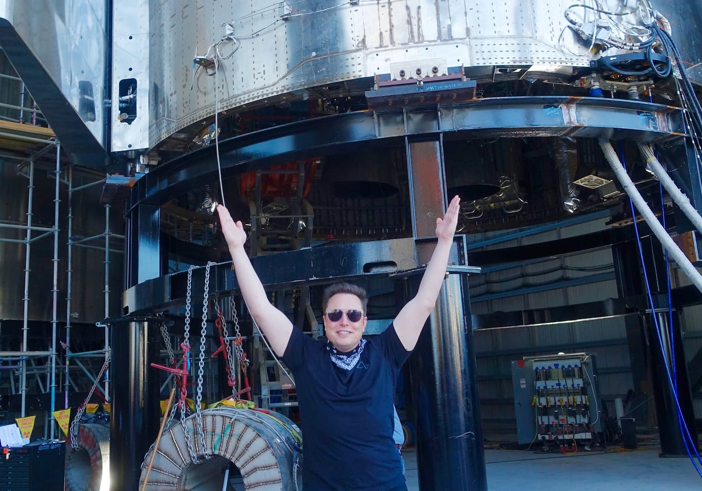 SpaceX CEO Elon Musk ceremoniously raises his arms beneath a prototype Starship rocket under construction in Boca Chica, Texas.