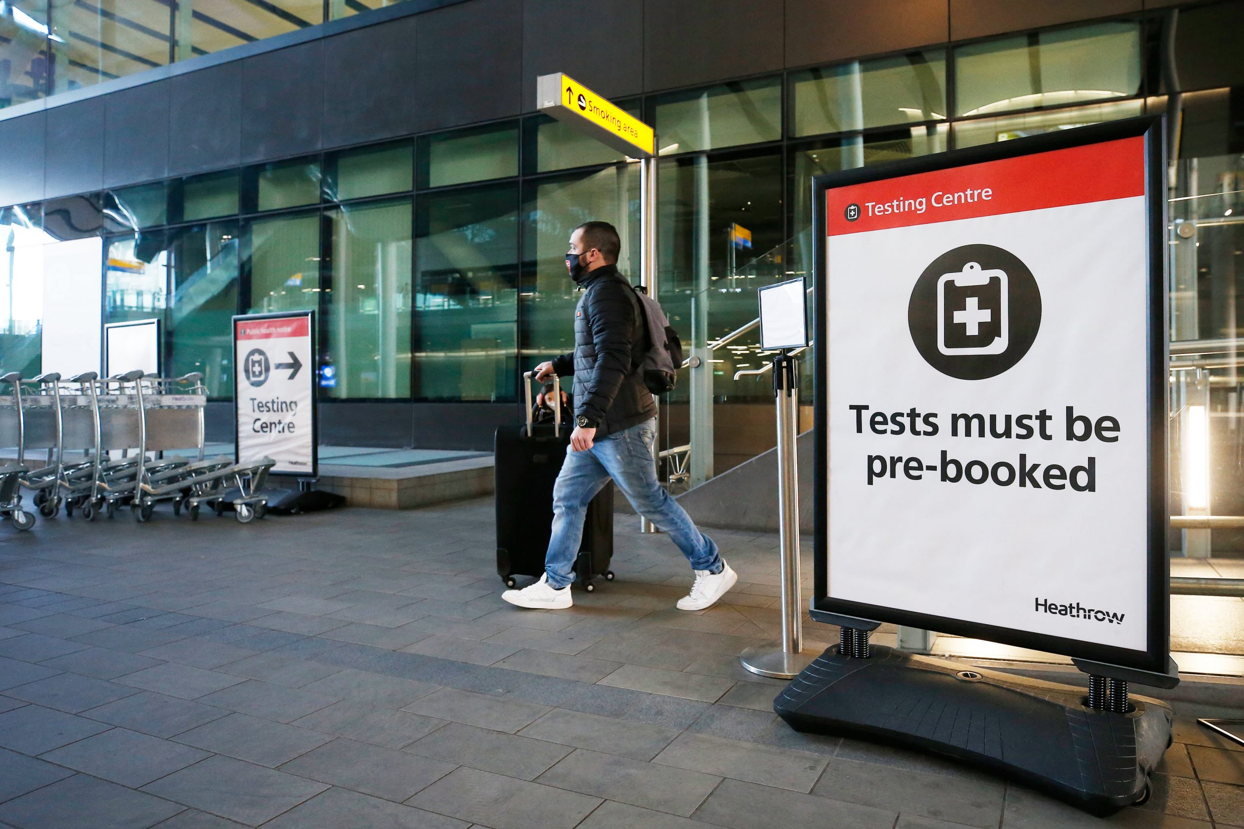 A traveler leaves a test center at Heathrow Airport in London on January 17, 2021.