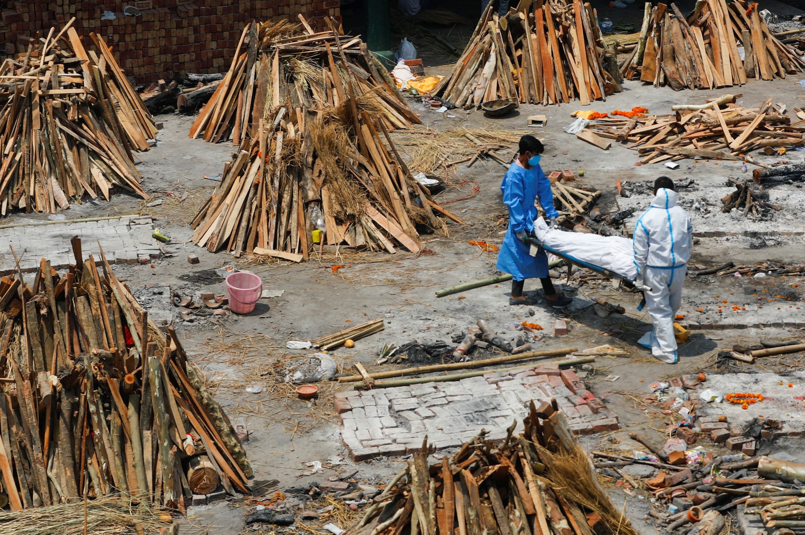 Individuals wearing personal protective equipment (PPE) wear the body of a person who died of coronavirus disease (COVID-19) during a mass cremation at a crematorium in New Delhi, India on April 26, 2021.