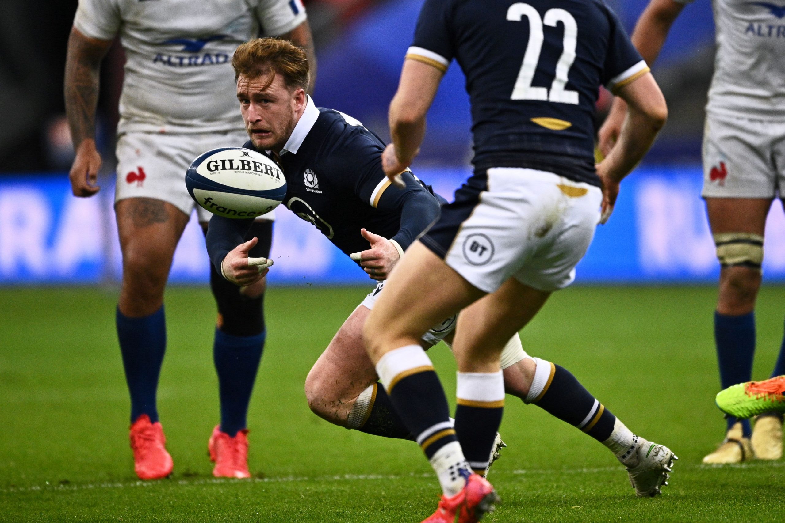 Scottish full-back Stuart Hogg plays the ball during the Six Nations rugby union tournament match between France and Scotland on March 26, 2021 at the Stade de France in Saint-Denis near Paris. (Photo by Anne-Christine POUJOULAT / AFP) (Photo by ANNE-CHRISTINE POUJOULAT / AFP via Getty Images)