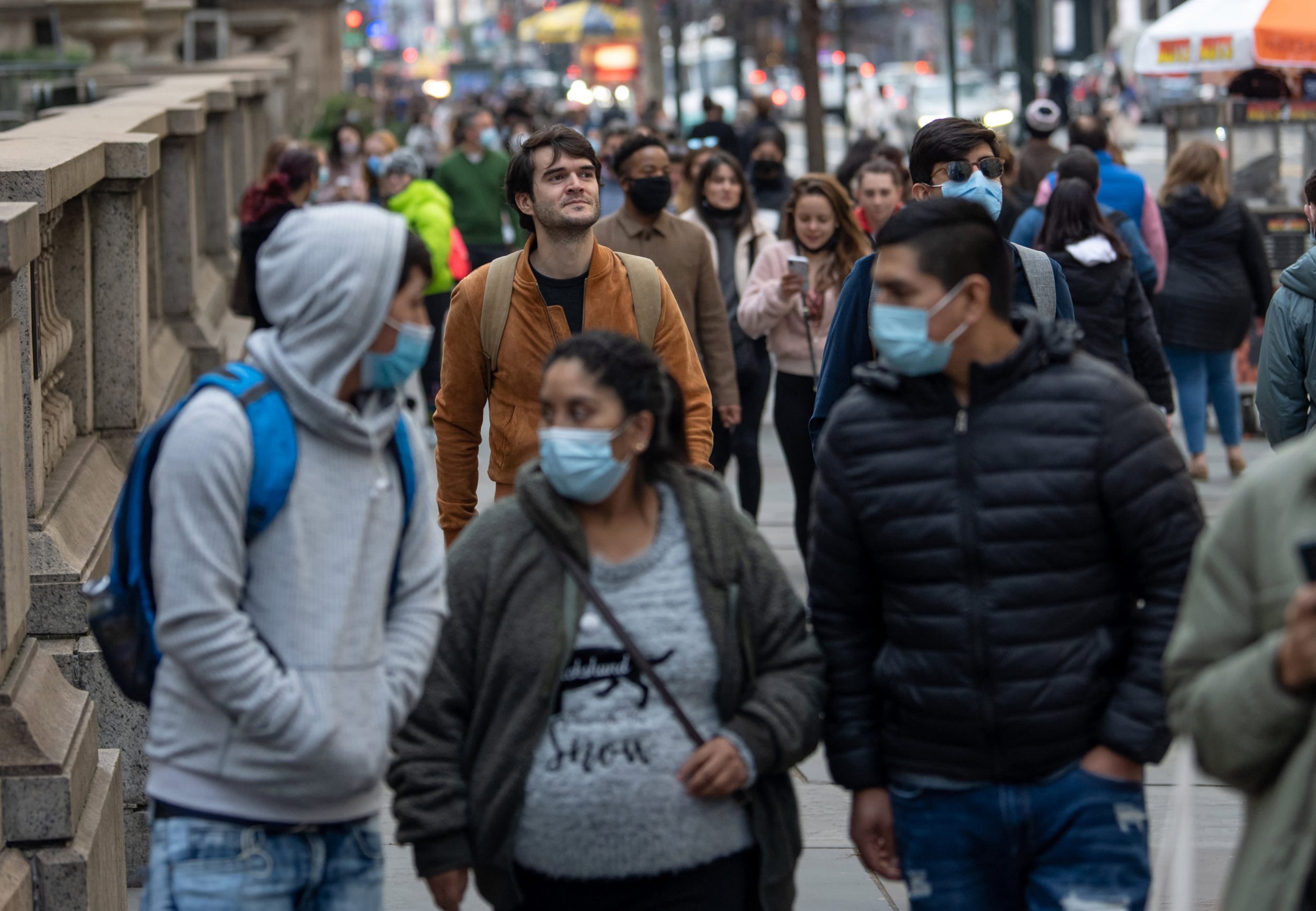A man without a mask walks through a crowd in New York City on December 13, 2020.