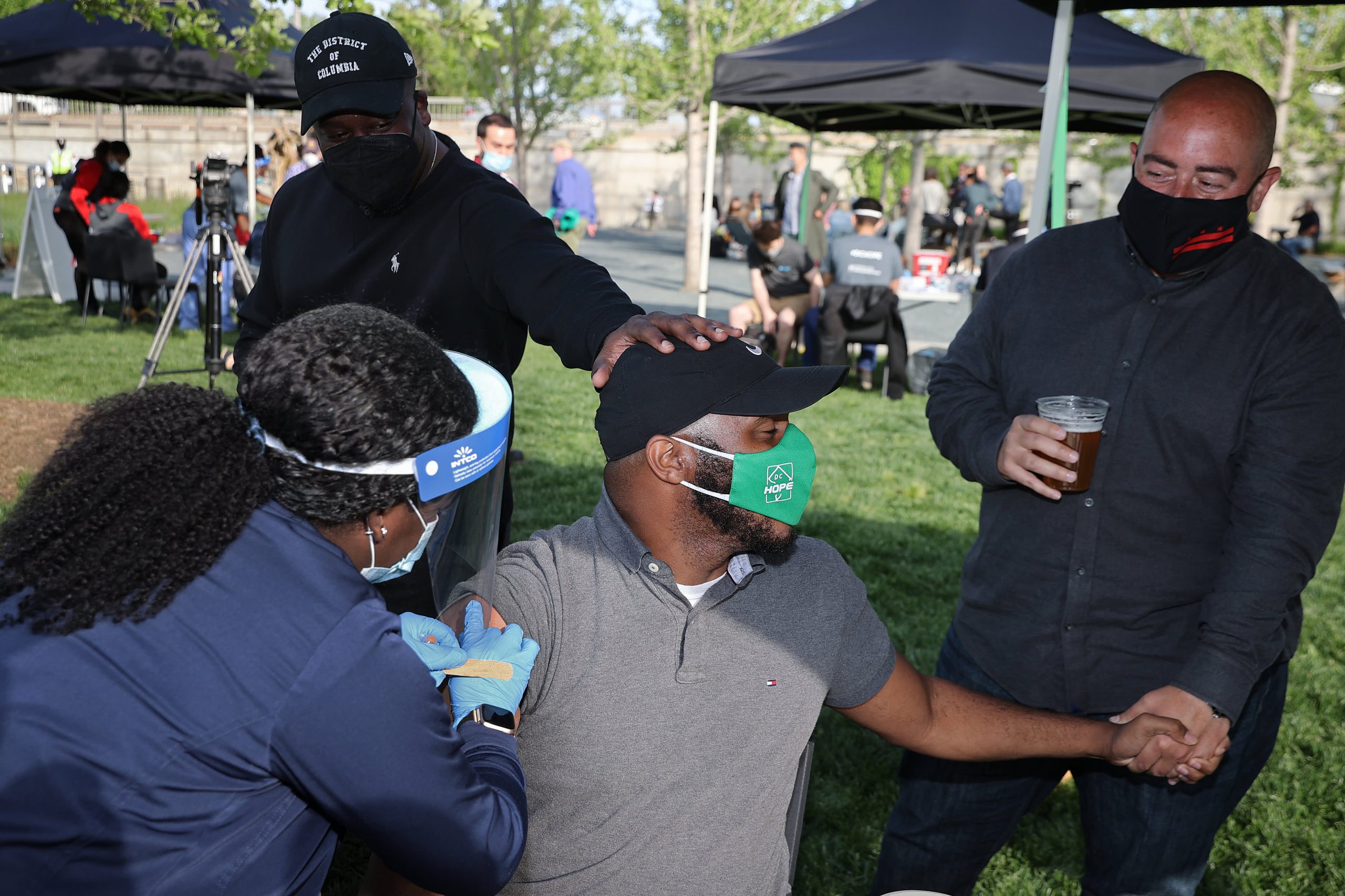 Jason Wallace (C), Director of the Fathers, Men, and Boys Commission for the District of Columbia receives some emotional support from the director of the DC Office of Nightlife and Culture, Shawn Townsend (L), and Deputy Mayor John Falcicchio (R) a shot of the Johnson & Johnson coronavirus vaccine by DC Health Nurse Kendria Brown during a walk-in clinic at the John F. Kennedy Center for the Outdoor Performing Arts on May 6, 2021 in Washington, DC.