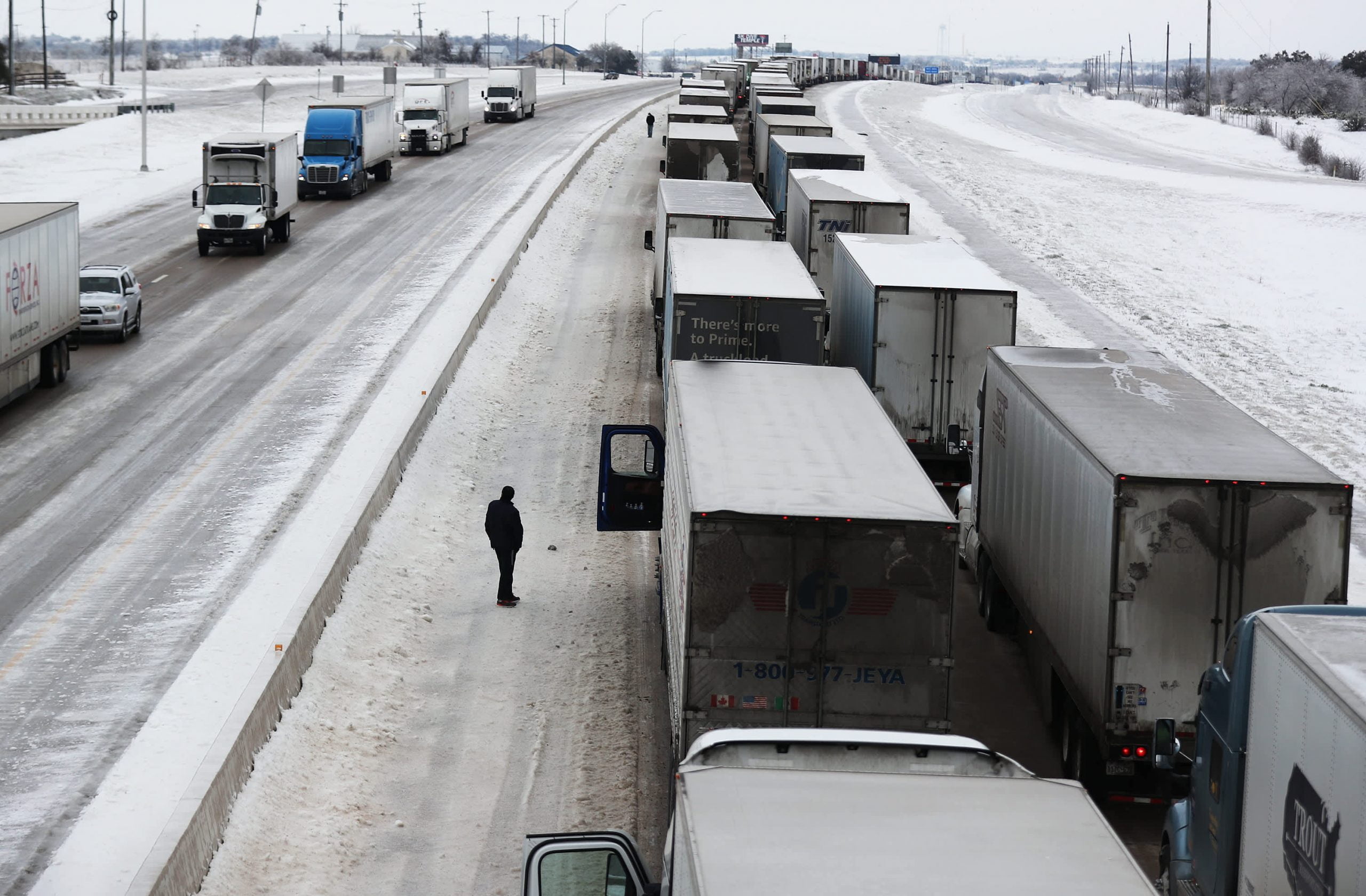 On February 18, 2021, vehicles will be idle on Interstate Highway 35 heading south in Killeen, Texas.
